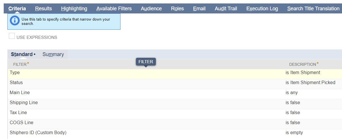 The Criteria ensures that only the Item fulfillments that are in Picked status that have been exported to ShipHero by Data Flow 2 will show up in the results.