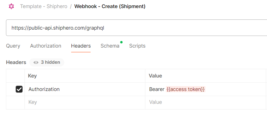 Authorization: Bearer {{Access Token}}The Access token that was used while setting up the ShipHero connection must be used here.